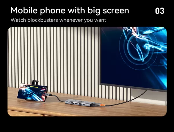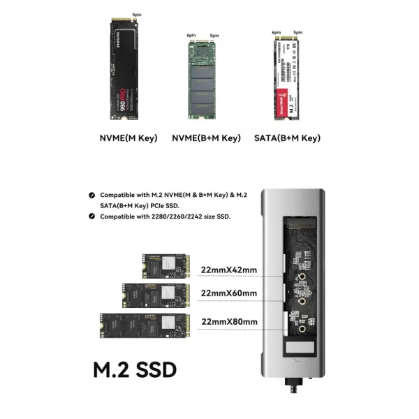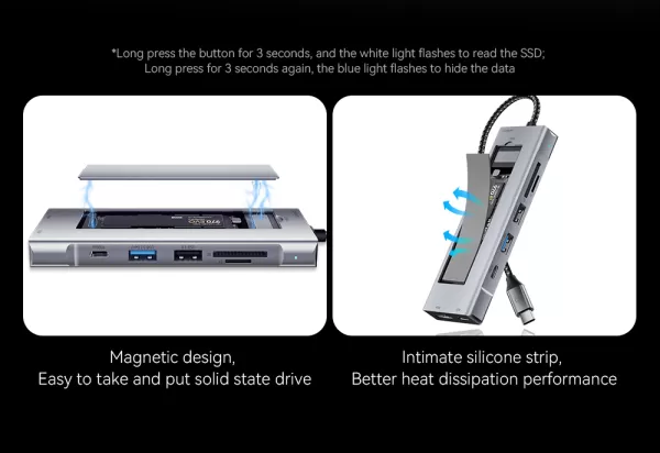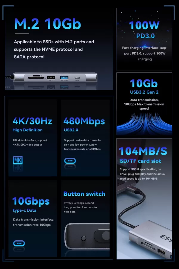 - 8 sąsajos: M.2 SSD/ USB3.2 / USB 2.0 / HDMI / Type-c 100W / Type-c 10Gpbps / SD / TF
